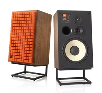 JBL L-100 Speakers – Designed by JBL (Harman) in Northridge, California, the JBL L-100 is a classic, stand-mounted speaker design that was used in the iconic Maxell cassette tape print ad in the 1970 with the guy being blown away by sound while sitting in a Le Corbusier chair. These speakers have been redesigned and re-engineered for the modern era but keep their vintage appeal visually.